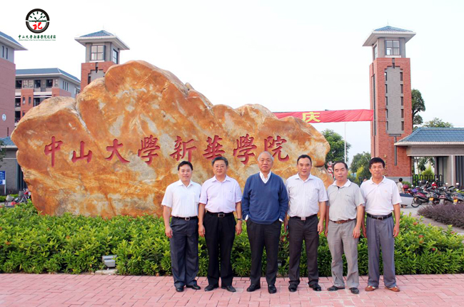 图1 丘成桐院士(左三)与学院领导在校门口校名碑前合影