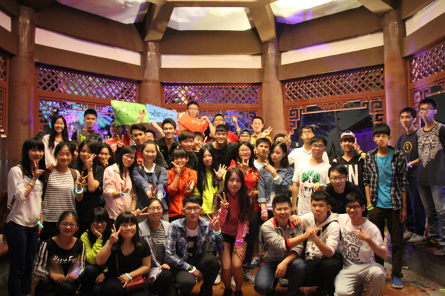 荧光夜跑队伍在校门口合影留念