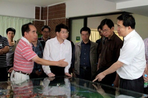 图1 我院蓝永金副院长(左一)向调研组专家们介绍校园建设规划蓝图