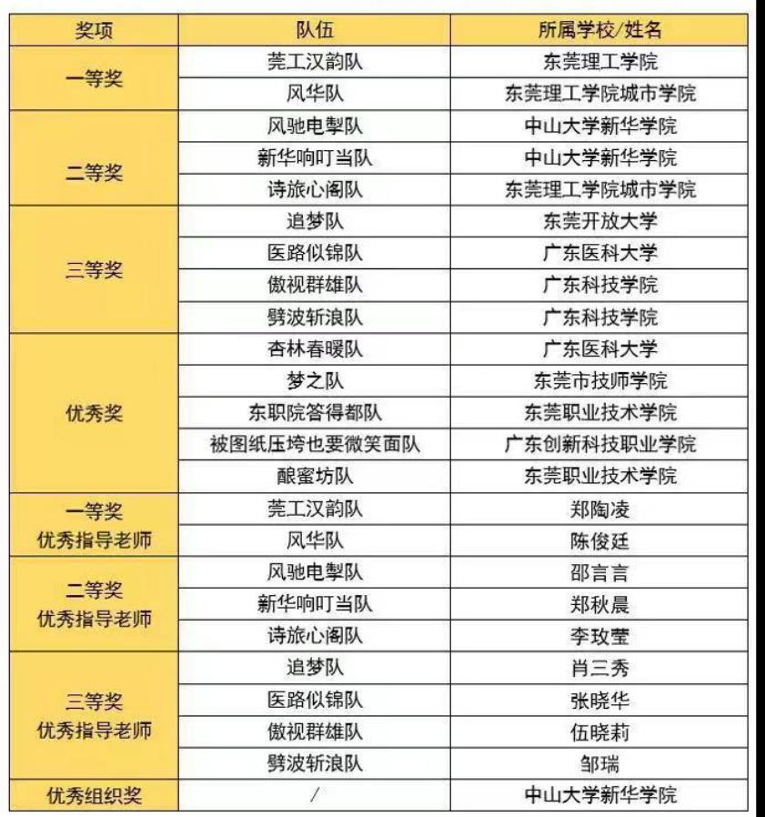 响叮当队”,来自东莞理工学院城市学院的“诗旅心阁队”获二等奖;来自东莞开放大学的“追梦队”,来自广东医科大学的“医路似锦队”,来自广东科技学院的“傲视群雄队”和“劈波斩浪队”获三等奖。