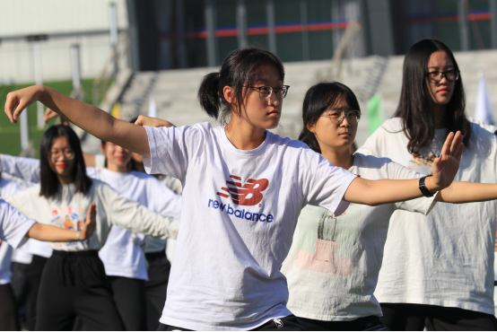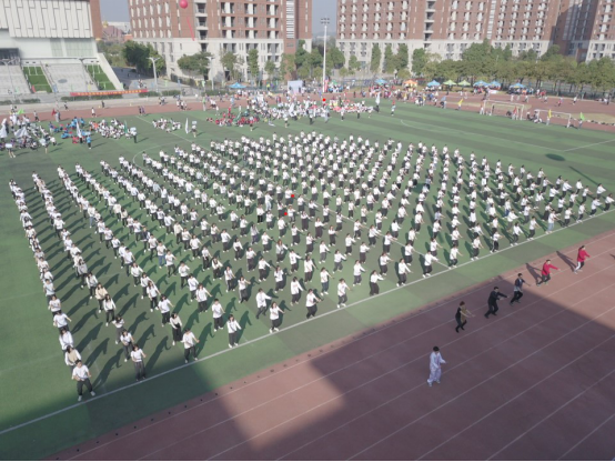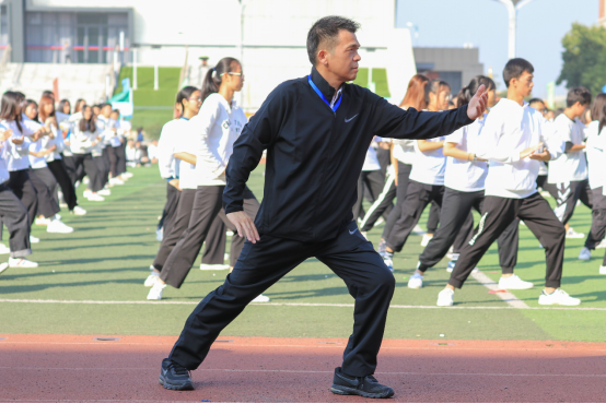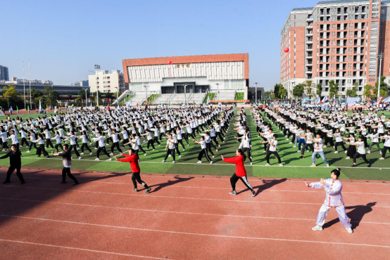 操场上演。在场千余名师生抱拳、起势、跌叉震脚……双手如同白云般柔和向外推出,在柔和的动作中藏着几分刚劲。四两拨千斤的气势巧妙变化于无形之中,一招一式展现出太极拳的独特魅力。绿茵场上,千余名师生在太极拳中感受体育运动的无穷魅力,彰显中大