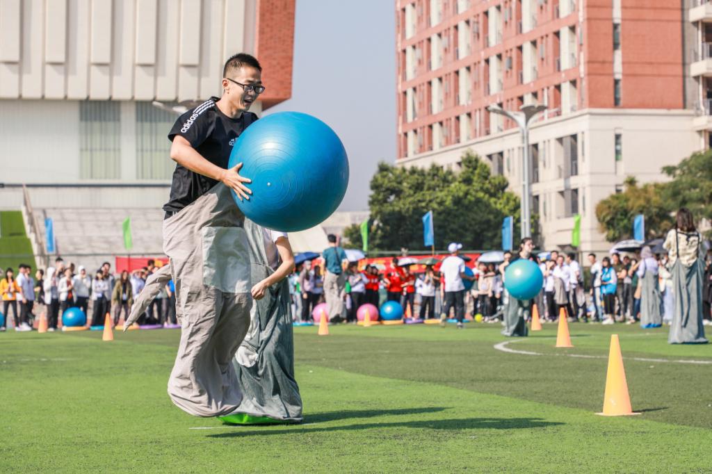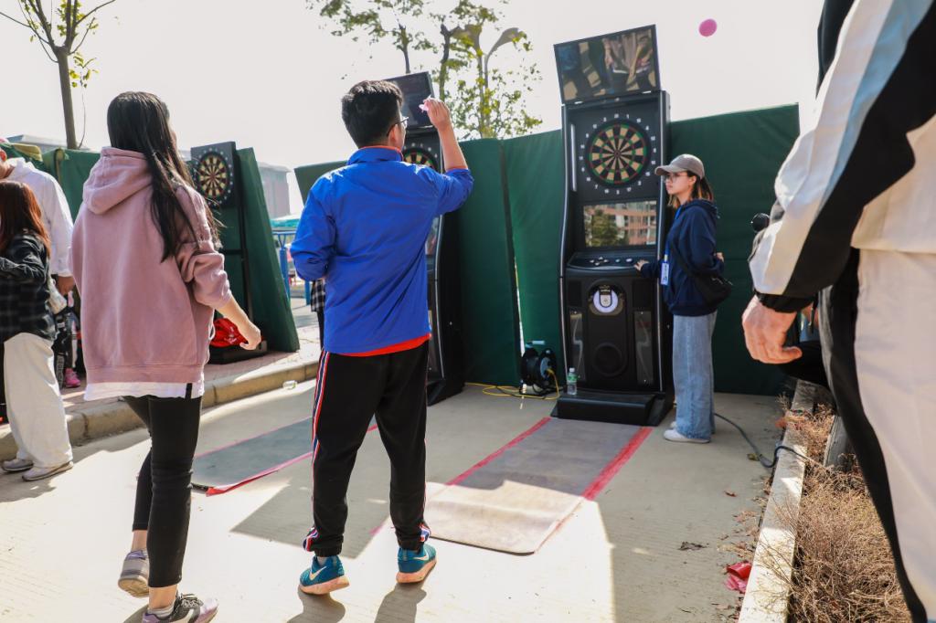 另一边,绿茵草坪上的教职工趣味运动比赛激情四射。教职工穿上袋鼠服装,奋力地跃起,传递出手中的彩色气球。在软式飞镖高分赛场上,其安全性、趣味性、竞技性深受师生喜爱,当选手们三镖都中红心时现场响起一阵阵喝彩。中大