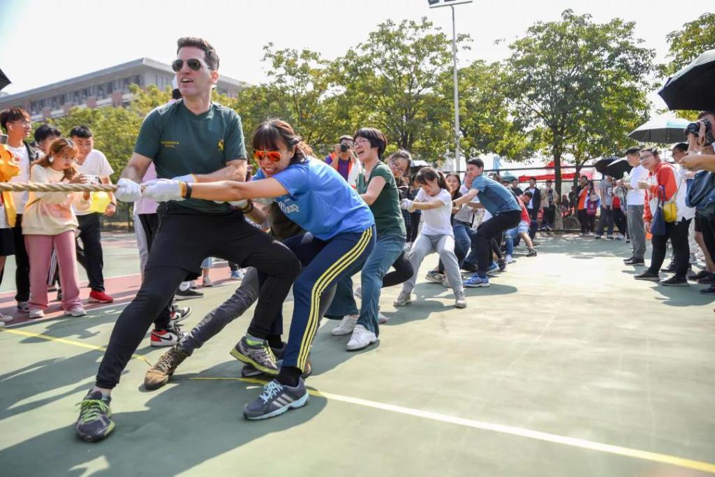 教师正以自身的实际行动展现出奋力拼搏、坚持与合作的体育精神。师生共同参与体育运动,彰显了体育运动的魅力。