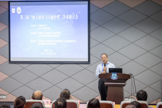 华南师范大学副校长陈文海教授致辞,首先对与会专家学者莅临华师表示热烈的欢迎与感谢,并简要介绍研讨会筹备背景,结合国际国内形势背景,指出举办此次研讨会的时代意义与学科价值,是贯彻落实党的十九届四中全会精神的具体举措,希望能聚大家之力,共商提升地方政府与区域现代治理能力。