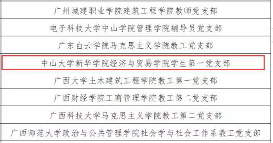 根据《教育部办公厅关于开展第二批新时代高校党建示范创建和质量创优工作的通知》(教思政厅函〔2019〕15号),经资格审查、专家推荐、教育部党的建设和全面从严治党工作领导小组成员单位集中审议,遴选产生了10个党建工作示范高校、100个党建工作标杆院系、1000个党建工作样板支部,我校经济与贸易学院学生第一党支部获评为“全国党建工作样板支部”。
