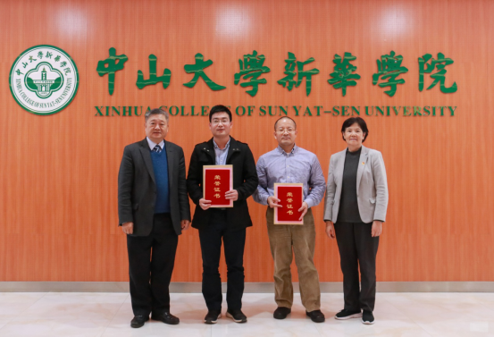 校长助理郑穗芬(左)、督导室主任陈汝筑教授(右)共同为2018年度科研先进个人三等奖代表颁奖