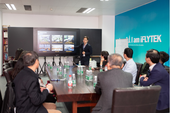 讲解员在向王庭槐校长一行介绍科大讯飞教育考试产品