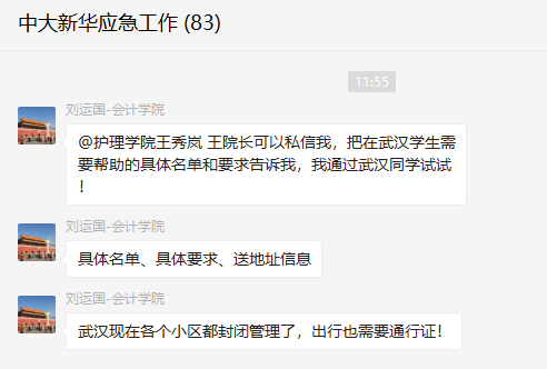 应急工作微信群(学校在疫情发生后即刻成立的由学校领导、各二级单位负责人组成的线上工作群)中发布了这样一则求助消息:“哪个部门有留在武汉的老师?能否帮忙在本地买御寒用品送到医护人员驻地?购物费用和交通费用我们出。快递现在要延误很久。”消息一经发出,立刻在群中引发了热议,大家纷纷发动自己的人脉,寻找解决办法。