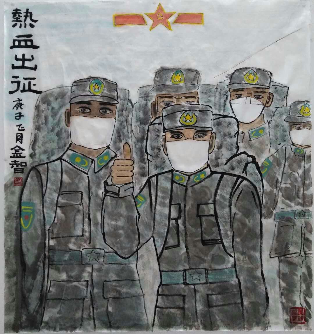 当国家面临疫情灾难时,中国人民奋起抗击。《热血出征》这幅画作,体现了军队医护人员响应习近平主席的号召,踊跃报名奔赴武汉疫区,驰援已经奋战在救护一线的医护工作者形象,是当代的青年军人朝气蓬勃、不畏艰险防控新冠肺炎疫情的真实写照。