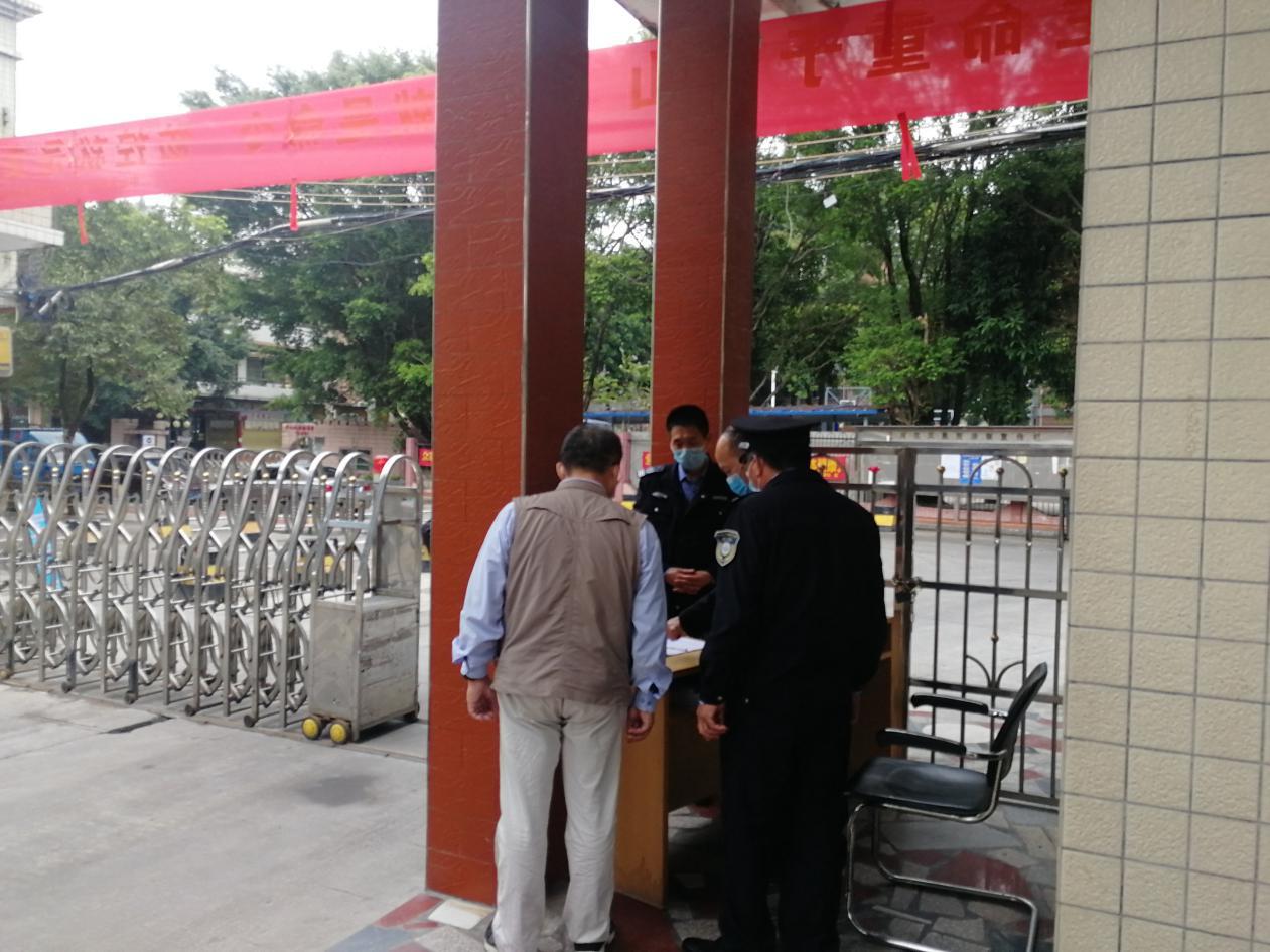 疫情期间,面对许多店铺关门停业的状况,保卫处黄志刚处长亲自在广州市区为数不多的打印店打印标识牌、横幅等,并送到两校区进行张贴和悬挂。图为黄志刚处长检查各门岗进出登记台账。