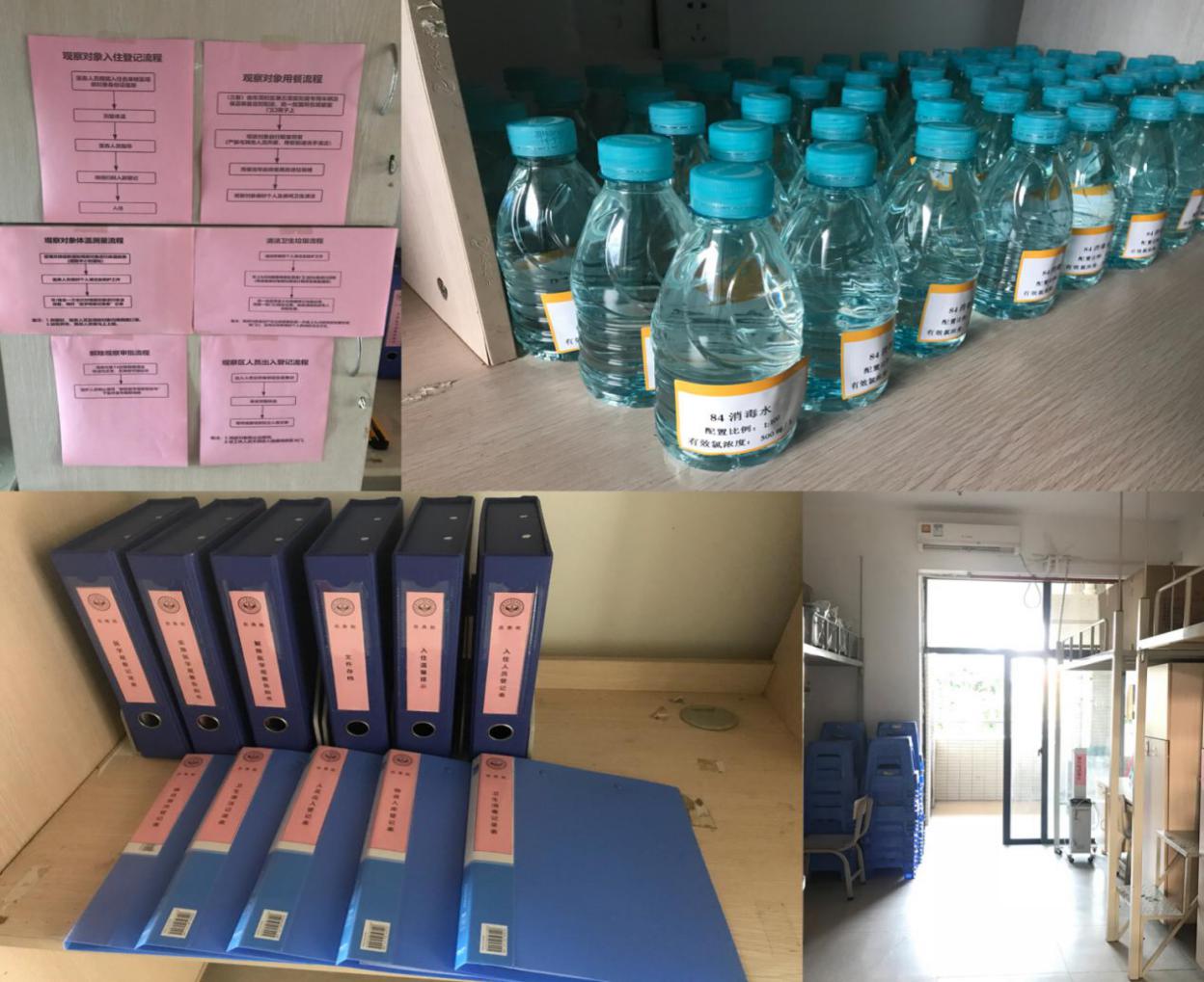 学院防控新型冠状病毒肺炎健康观察区工作制度》,规范管理、医务、消毒等六个流程,违规及发热等两个应急预案,出入登记、体温测量、卫生消毒、垃圾处理等十一类登记台账。