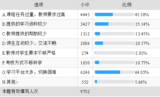 根据同学们对“你认为现阶段学校开展线上教学存在那些问题可以改进?”这一问题的回答,我们了解到由于不同课程教师使用的平台不同,导致学生学习平台过多,64.05%的学生认为APP来回切换有负担;此外,45.58%的学生认为网络教学课程任务过重,35.14%的学生认为目前阶段提供的学习资料较少,等等。