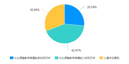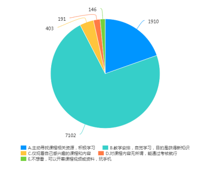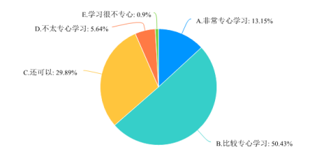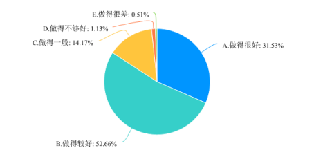 在“从总体上看,你觉得网络教学中教师在不断改进教学方面做得怎样?”这一问题中,认为教师“做得很好”的同学占31.53%、“做得较好”占52.66%、“做得一般”占14.17%,而另有1.13%的同学认为“做得不够好”和0.51%认为“做得很差”。说明至少有84.19%的同学认可教师在改进教学方面做的努力,这也与教务处发放调查问卷的初衷——“根据学生的满意度和意见不断改进网络教学方案和实施细则”相契合。