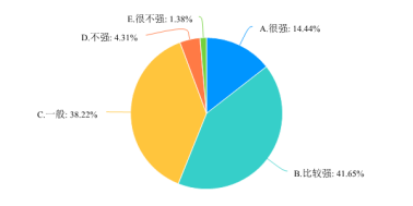 对“网络学习和居家自修,自律性很重要;你的自律性如何?”这一问题中,回答“很强”的同学占14.44%,“比较强”占41.65%,“一般”占38.22%,另有4.31%的学反馈“不强”,1.38%反馈“很不强”,这说明有超过半数的学生自律性较强,但也有相当一部分学生的自律能力有待加强。