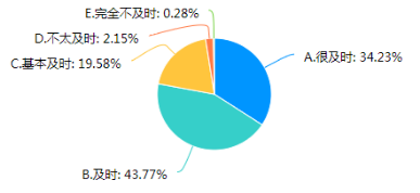对“在线课堂中能与教师交流通畅,及时得到教师的指导与反馈”这一问题,回答“很及时”的同学占时34.23%,“及时”占43.77%,“基本及时”占19.58%,总体及时率为97.58%。