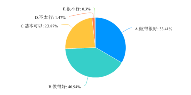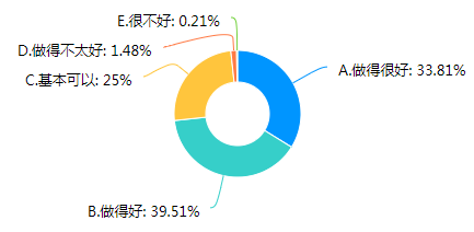 对“教师是否可以做到根据进度表的安排准时开课,并合理实施在线考勤、讲解、讨论、测验、作业等环节”这一问题,回答“做得很好”的同学占33.41%,“做得好”占40.94%,“基本可以”占23.87%,另有1.47%的同学认为“不太行”,0.3%认为“很不行”,说明有98.22%的同学认可教师的网络授课安排。