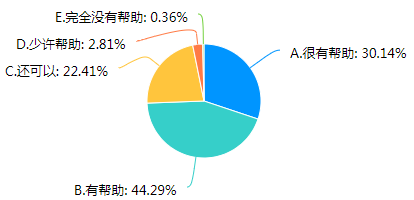 对“教师提供的学习资料,例如课件、视频、电子资料是否丰富、有序,有助于学生自主学习”这一问题,回答“很有帮助”的同学占30.14%,“有帮助”占44.29%,“还可以”占22.41%。