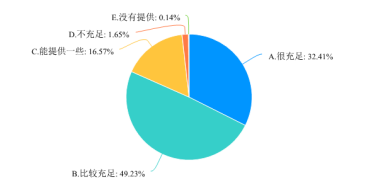 对“你在进行网络学习时,教师是否能提供充足的学习资料”这一问题,回答“很充足”的同学占32.41%,“比较充足”占49.23%,“能提供一些”占16.57%,另有1.65%的同学认为“不充足”,0.14%反馈“没有提供”,说明有98.21%的同学认为教师能够为学生提供学习资料,其中回答“很充足”和“比较充足”的比例相比第一周的调查结果分别有2.27%和4.94%的提高。