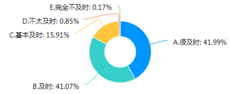 对“教师及时在网络教学平台上导入学生名单,发布课程教学大纲、教学进度等信息”这一问题,回答“很及时”的同学占41.99%,“及时”占41.07%,“基本及时”占15.91%,另有0.85%的同学认为“不太及时”,0.17%认为“完全不及时”。