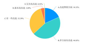 对“相比第一周出现的问题,近两周教师的在线教学是否有了针对性的改进”这一问题,认为“改进得很全面”的同学占18.33%,“多方面有改进”占44.85%,“有一些改进”占32.39%,另有3.89%同学认为“基本没有改进”,0.55%认为“完全没有改进”,说明95.57%的同学认为教师的网络教学有了不同程度的改进,也说明我们针对学生开展的授课情况调查是有实际意义的,多数教师能针对学生提出的意见积极改进,更好地提高网络教学质量。