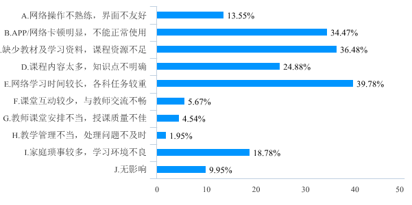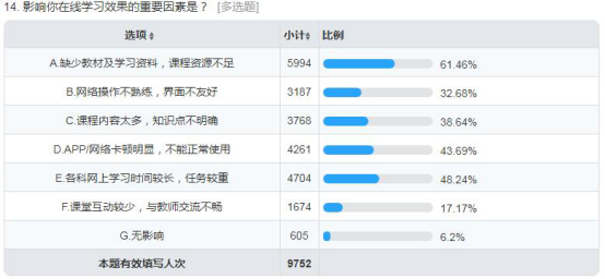 对“影响网络学习效果的重要因素”这一多选问题,缺少教材和学习资料成为首要的因素,其次,部分同学认为“各科网上学习时间较长,任务较重”,另外,APP、网络卡顿等客观原因也对同学们的学习效果造成了一定的影响。