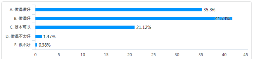 对“教师按照进度表的安排准时开课,并合理实施在线考勤、讨论、测验、作业等环节”这一问题,回答“做得很好”的同学占35.3%,“做得好”占41.74%,“基本可以”占21.12%,满意度为98.16%。