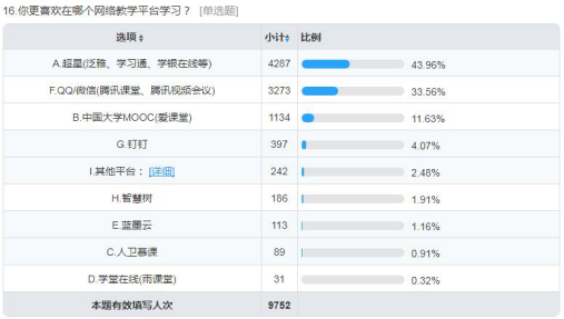 对“你更喜欢在哪个网络教学平台学习?”这一问题,43.96%的同学认为超星(泛雅、学习通、学银在线等)体验更好,33.56%的同学更喜欢腾讯系列平台。