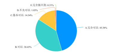 对“你是否可以做到按照课表安排准时进入在线课堂学习”这一问题,回答“完全可以”的同学占45.58%,“可以”占38.65%,“基本可以”占14.54%,另有1.03%的同学反馈“不太可以”,0.21%反馈“完全做不到”,说明98.77%的学生学习积极性良好。