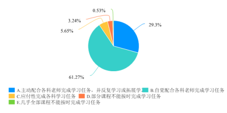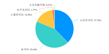 对“你是否可以按时完成教师的线上学习安排(听课、测验、作业等)”这一问题,回答“完成可以”的同学占37.76%,“可以”占43.64%,“基本可以”占16.56%,另有1.77%的同学反馈“不太可以”,0.24%反馈“完全做不到”,说明97.96%的同学能够跟上教师的教学进度。