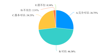 对“在线课堂中是否可以与教师交流通畅,及时得到教师的指导与反馈”这一问题,回答“完全可以”的同学占26.75%,“可以”占46.38%,“基本可以”占24.23%,另有2.31%的同学认为“不太行”,0.34%认为“很不行”,说明有97.36%的同学认为可以及时得到教师的指导与反馈。