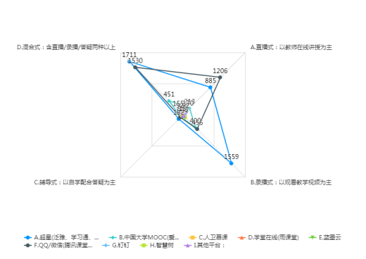 综合学生网络学习模式体验度以及平台喜好度交叉分析数据如图1-14,说明运用超星、腾讯这类实时互动的教学平台并行多种教学模式的网络教学方式是多数学生乐于接受的,这也是我校网络教学的主流方式。