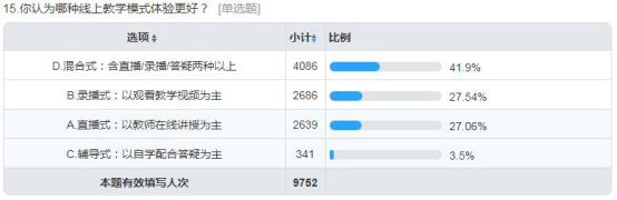 对“你认为那种网络教学模式体验更好?”这一问题,认为混合式教学体验更好的共计4086人(总占比41.9%),认为录播式教学体验更好的共计2686人(总占比27.54%),认为直播式教学体验更好的共计2639人(总占比27.06%),而认为辅导式教学体验更好的仅有341人(总占比3.5%)。据此,教师们也可以改进教学模式,提高学生的学习体验。