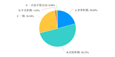 对“你对在线课堂与老师互动的态度是”这一问题中,回答“非常积极”的同学占20.69%,“比较积极”占50.33%,“一般”占26.34%,另有1.65%的同学认为“不太积极”,0.99%认为“一点也不想互动”,说明学生学习主动性整体良好。