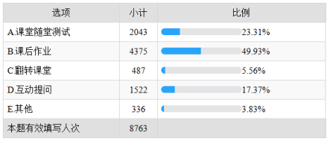 对“你认为哪种线上教学学习效果的检验方式比较合理”这一问题中,同学们认为合理的学习效果检验方式排名依次是:课后作业占比49.93%,课堂随堂测试23.31%,互动提问17.37%,翻转课堂5.56%,其他3.83%。