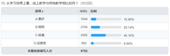 对“从学习效果上看,网络教学与传统教学相比如何?”这一问题,认为网络教学比较好的占16.86%,认为效果相同的占28.14%,认为传统教学效果比较好的占46.16%,无明显察觉的占8.84%。说明目前单一的网络教学效果并不能很好的满足同学们的学习需求。