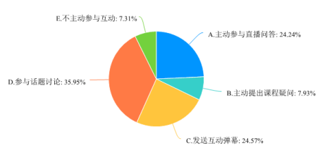 对于“你心目中理想的线上教学应该是怎样的?(可针对某门课程提出意见和建议)”这样的开放式问卷,31.99%的同学积极填写了意见,多数学生希望老师能够直播互动(设置回看),在线答疑,加强沟通;希望能够统一教学平台,避免不同课程之间反复切换;有学生反馈网络学习任务较重,使用电子设备的时间过长,希望能有更多的时间自主学习等等。