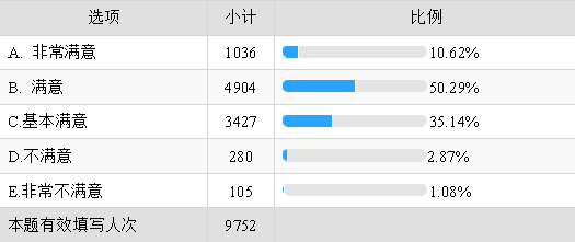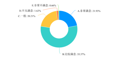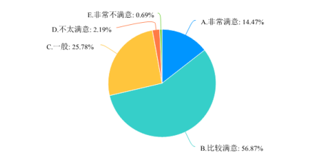 对于“你对本次线上教学的总体安排满意度如何”这一问题,回答“非常满意”的同学占10.62%,“满意”占50.29%,“基本满意”占以35.14%,整体满意度为96.05%。