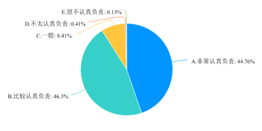 对“你认为在线教学时教师的教学态度如何”这一问题中,回答“非常认真负责”的同学占44.76%,“比较认真负责”占46.30%,“一般”占8.41%,另有0.41%的同学认为“不太认真负责”,0.13%认为“很不认真负责”,说明有91.06%的教师教学态度良好,对学生认真负责,但也有0.54%的学生认为教师不负责任。对此,希望各院系能引起重视,通过巡课、听课、收集学生反馈意见等环节及时发现问题,做好引导工作,使所有教师都能端正教学态度。