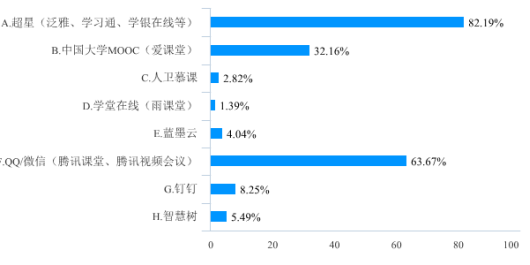 对“从本周学习情况来看,你更喜欢在哪个网络教学平台学习?”这一问题(双选题)中,同学们对网络教学平台的偏好度依次是:超星(泛雅、学习通、学银在线等)82.19%、QQ/微信(腾讯课堂、腾讯视频会议)63.67%、中国大学MOOC(爱课堂)32.16%、钉钉8.25%、智慧树5.49%、蓝墨云4.04%、人卫慕课2.82%、学堂在线(雨课堂)1.39%。该顺序与第一周调查结果一致,说明超星、腾讯两大平台能持续为教师和同学带来良好的教、学体验。