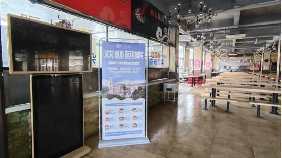 校园里随处可见的海报、横幅、LED屏幕上写着:欢迎同学们回家!提醒师生随时注意卫生与做好个人防护。
