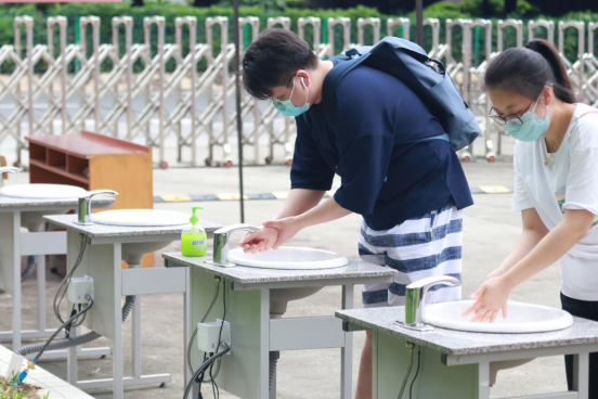 校门口、食堂门口、教学楼、校道均配有洗手池、洗手液、洗手方法指引