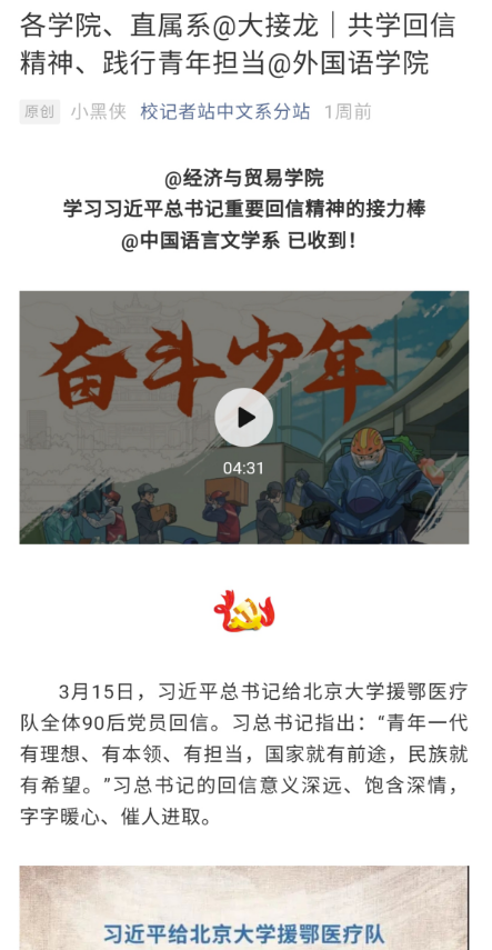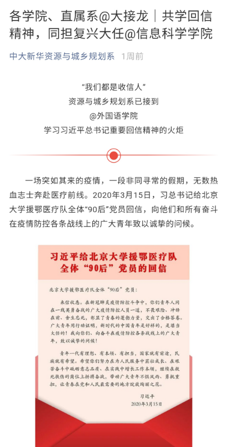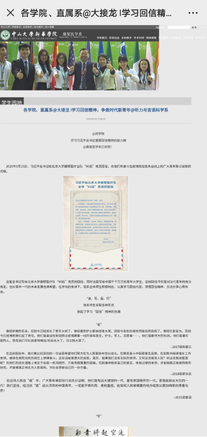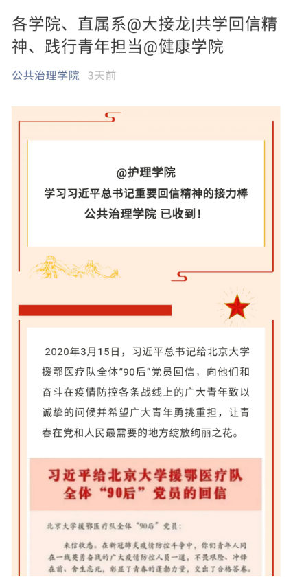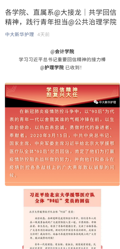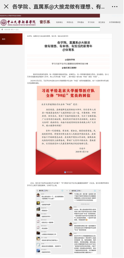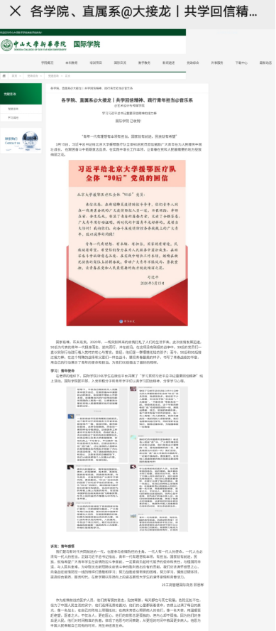 为深入学习贯彻习近平总书记给北京大学援鄂医疗队“90后”党员重要回信精神,积极响应广东省高校网上交流“@大接龙”活动,推动形成大学习、大讨论、大实践的活动态势,学校印发了《中山大学