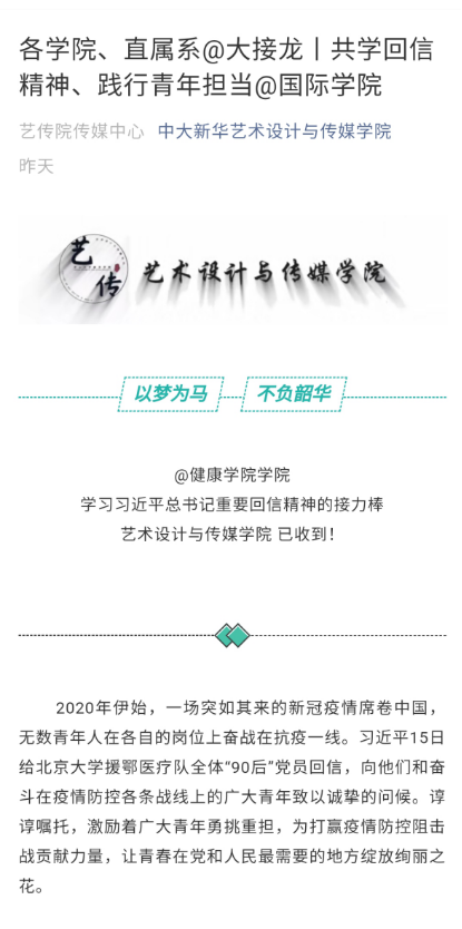 学院党委宣传部接过广东岭南职业技术学院传来的火炬,在官微平台发布接龙推文,党委学生工作部和校团委两个牵头单位迅速响应、统筹组织,同时掀起两条校内接龙线路的序幕,“@大接龙”活动火热进行。