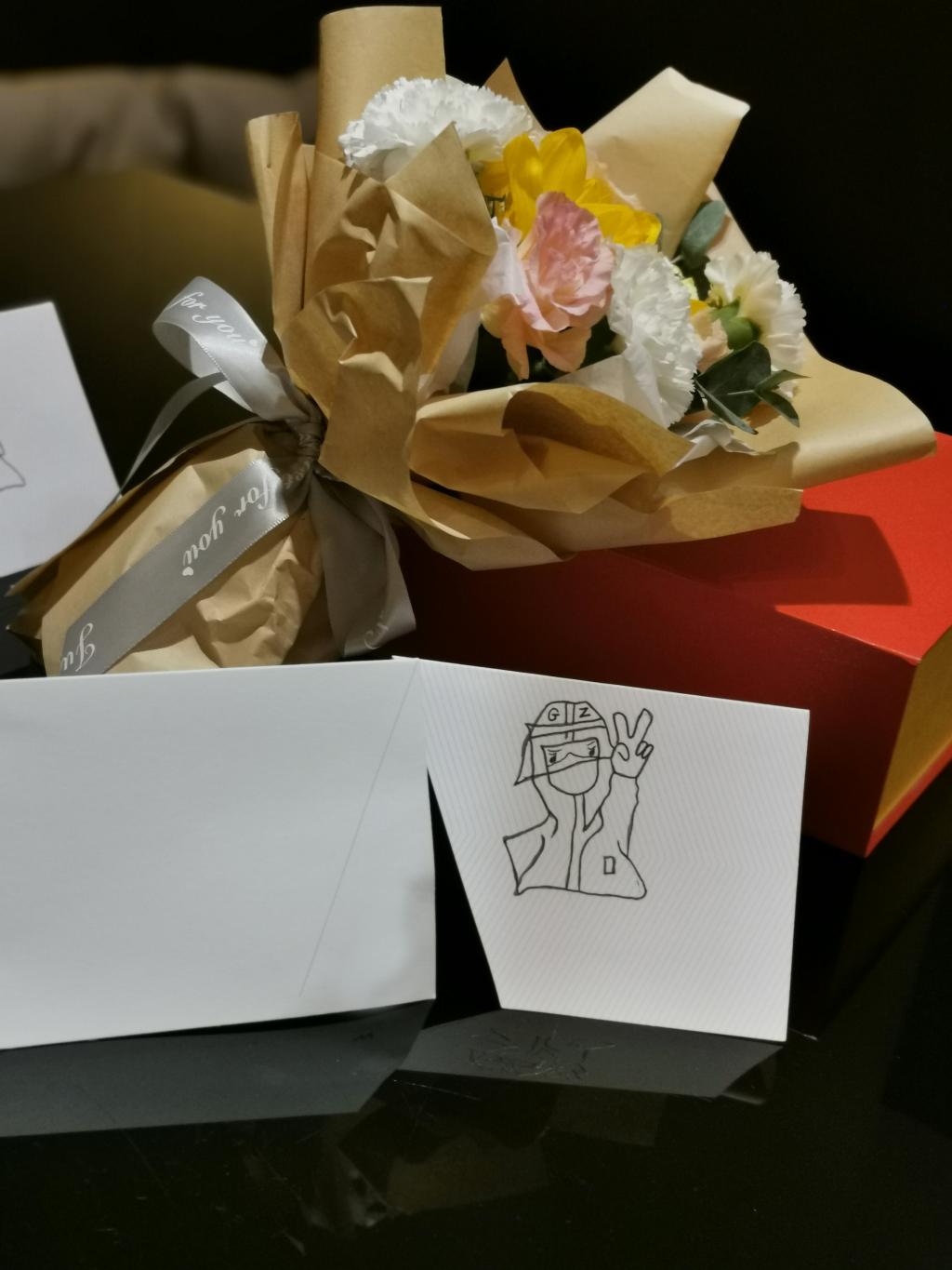 当晚,听闻当晚接待的是援鄂英雄,餐厅经理带领工作人员手绘卡片,准备鲜花,送给战疫天使。邻桌的客人们哽咽着拱手说:“谢谢你们!正是有你们无论生死、不计报酬地挺身而出,才有我们今日的国泰民安,感恩你们!”
