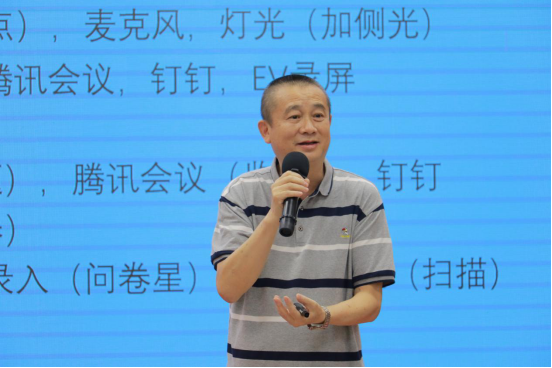 从教学方案表的资料上传,到课堂出题、随机问答,再到自购激光笔和测试自带扩音机等线上线下教学方式的探索,江沛将自己的经验、感悟和教学趣事娓娓道来,风趣幽默的分享引发在场师生的热烈反响。