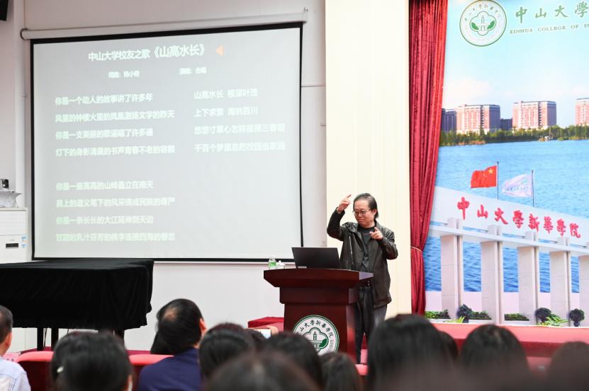 讲座尾声,陈小奇教授应王庭槐校长盛情邀请,亲自担当合唱指挥,全场师生合唱中山大学第二校歌、校友之歌《山高水长》。“山高水长,根深叶茂,上下求索,海纳百川……”这首歌为陈小奇在中山大学建校75周年时所著,苍劲的歌词和悠扬的旋律已陪伴一代又一代青年学子度过了无数宝贵的大学时光,代代学子不忘恩师之教诲、中大之校风。活动现场,熟悉的旋律与歌词再次响起,优美的音乐伴随着现场师生富有感情的合唱,音律悠扬,让人为之动容。