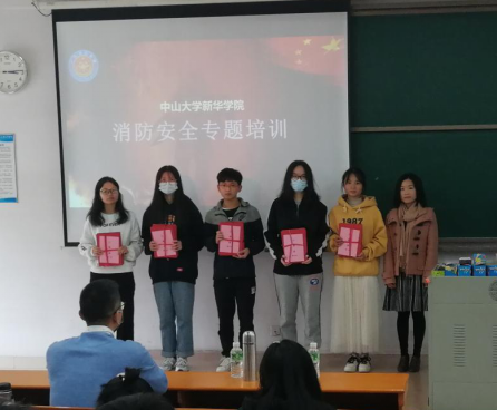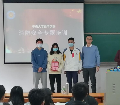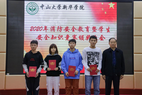 总务处处长谢凯忠(右一)为2020级学生安全知识竞赛获奖者颁奖