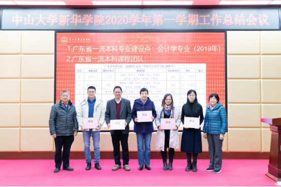 王庭槐校长(左一)、周云书记(右一)为获评“广东省一流本科专业建设点:会计学专业(2019年)”“广东省一流本科课程团队”代表颁奖