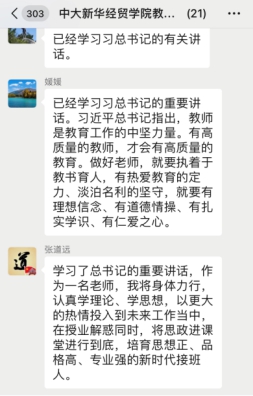 中文系专职教师李想:在过去的2020年,我们共同面对疫情的考验,医护人员奋勇抗击新冠疫情,作为老师的我们,开启了新的教学模式——线上教学。如今听习近平总书记谈起的时候,不禁又一次回想起了2020年不寻常的时光。的确,“教育是国之大计、党之大计。”作为新时代的女性,作为一名人民教师,我将坚守我的岗位,为党育人,把立德树人融入到每一节课中,让学生感受我们祖国的美好,感受文化自信,身体力行地融入到中国梦的筑梦、铸魂之中。