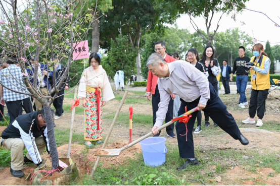 春草初盛,我们共同栽下樱花树,寓意学校欣欣向荣、越办越好,也希冀同学们韶华灼灼,不负春光。